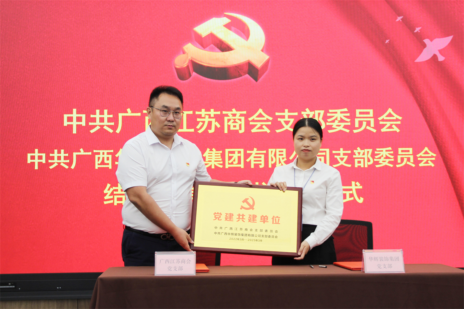 签约仪式上,商会党支部书记王伟、凯发k8官网装饰集团党支部书记刘萍东签订了结对共建协议,并由王伟同志代表广西江苏商会党支部向广西凯发k8官网装饰集团有限公司党支部赠牌。