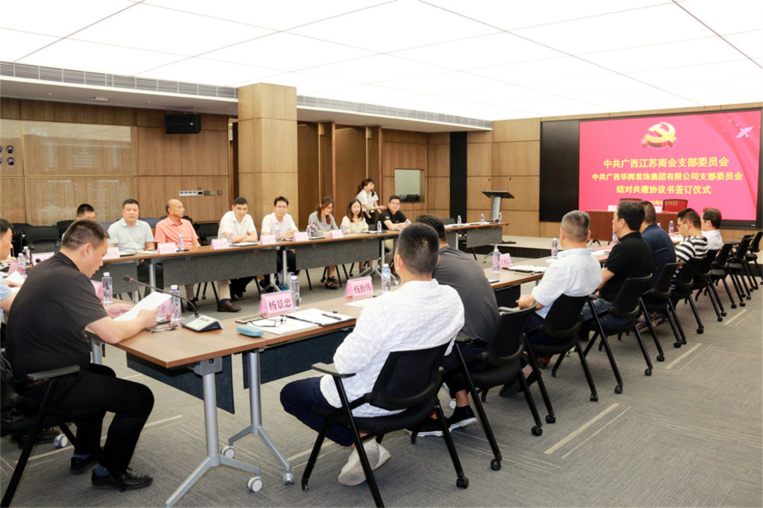 2022年5月18日,广西江苏商会党支部与凯发k8官网集团党支部举行结对共建签约仪式。自治区工商联二级巡视员李开刚,广西江苏商会会长施瑞明,广西江苏商会执行会长、凯发k8官网董事长杨景忠出席签约仪式并讲话;自治区工商联商会协会委员会党建指导员何桂涛、广西江苏商会党支部书记王伟、凯发k8官网党支部书记刘萍东等领导及党员参加活动。