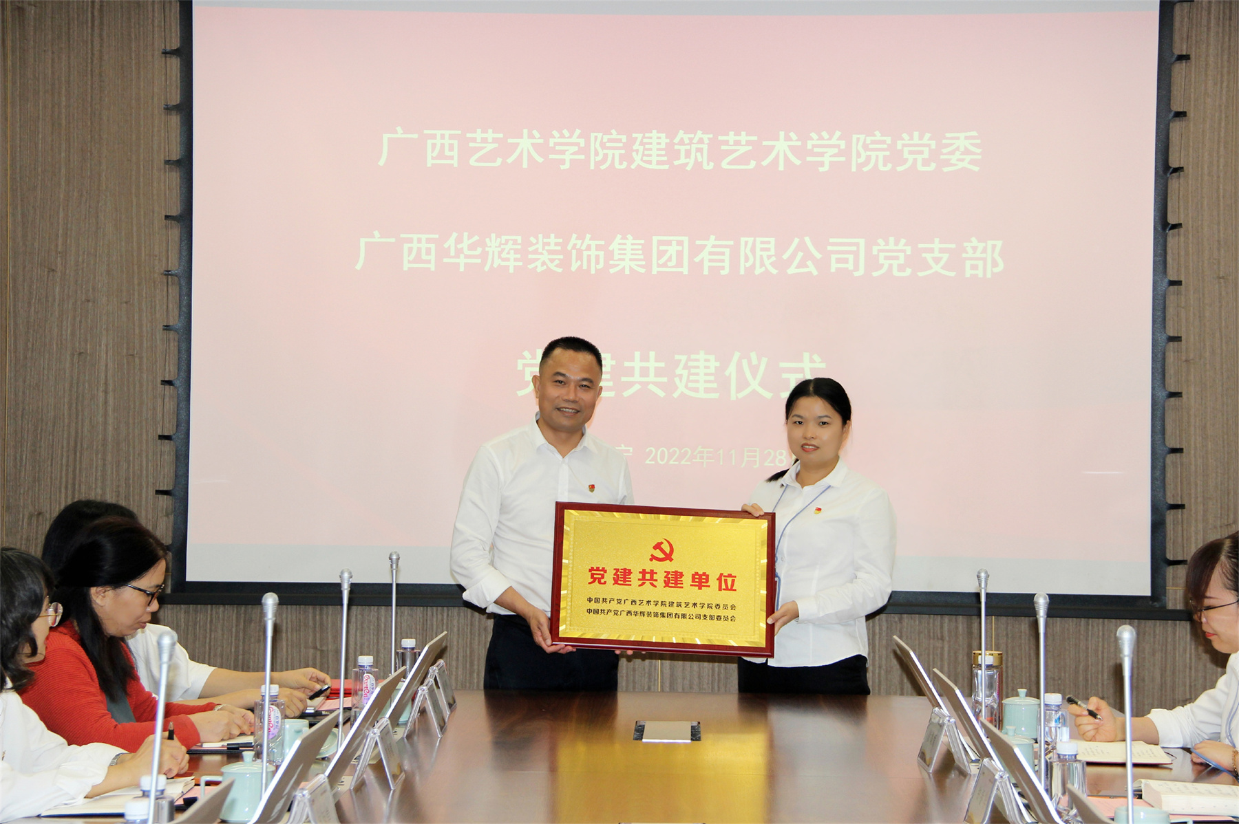 2022年11月28日,广西艺术学院建筑艺术学院党委与广西凯发k8官网装饰集团有限公司党支部,开展“学习贯彻党的二十大精神”联合主题党日暨党建共建仪式;同时,广西艺术学院建筑艺术学院与广西凯发k8官网装饰集团有限公司,举行了“联合共建校外实践教育基地”揭牌仪式。