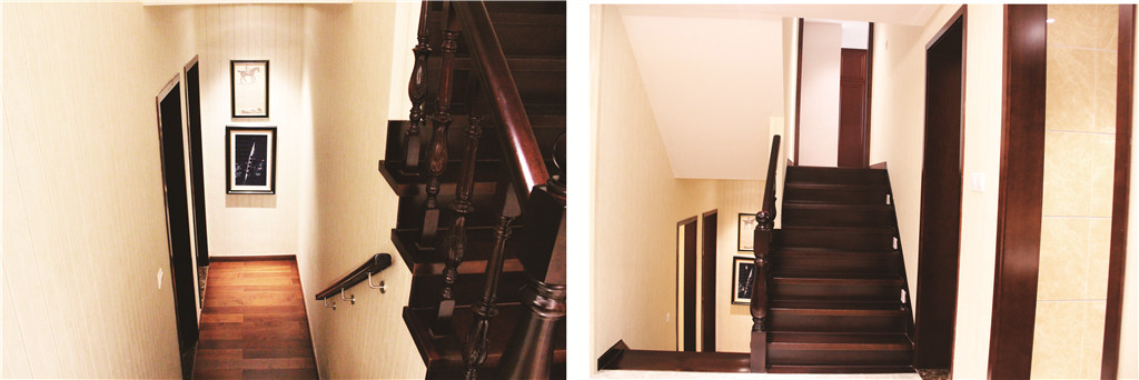 过道:楼梯及扶手均为实木材质,与过道木地板相协调,演绎奢华别致的错层风格。