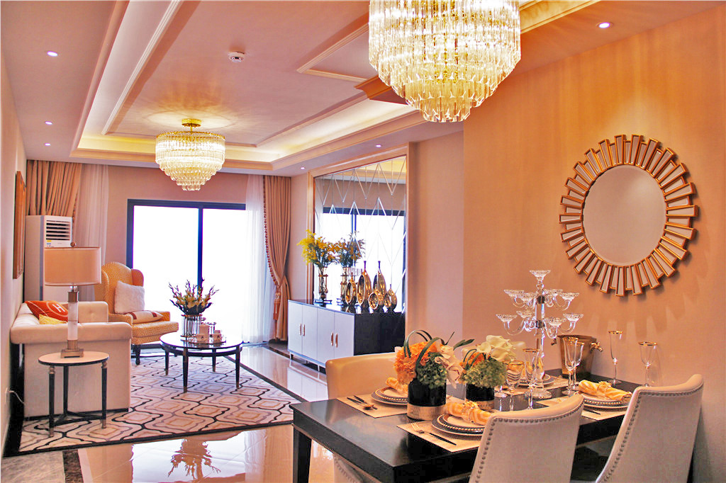 客厅、餐厅:华丽吊灯营造大气且充满温馨感的居家氛围。地面以简约的走线风格,规整且自然,电视背景墙的石材边框,让空间更宽阔,承载全家人的幸福生活。
