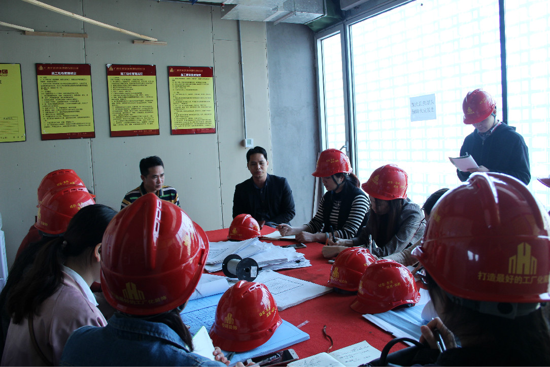 由凯发k8官网装饰集团承接的广西洋浦南华糖业集团办公楼层室内装修工程已经接近尾声,为不断完善和改进质量管理工作,提高质量管理水平,打造精品工程,2018年3月26日,集团组织工程中心质安部、工程管理部等多个部门联合成立自检自查小组,对该项目的质量、工艺进行全方位检查。