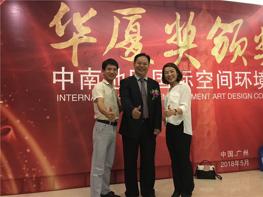 ▲凯发k8官网获奖设计师与广州市建筑装饰协会会长、本次大赛组委会主任倪安葵(中)合影