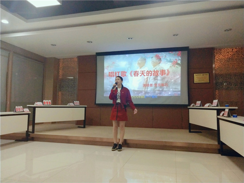 党员一曲红歌《春天的故事》为大家展开改革开放史诗般的壮丽画卷,现场全体人员齐声高唱《歌唱祖国》,用歌声表达浓浓爱党爱国之情。