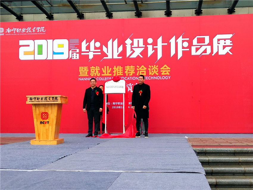 开幕式举行了南职院艺术工程学院与凯发k8官网装饰集团“校企合作人才培养基地”揭牌仪式,南宁职业技术学院艺术工程学院党委书记张治中、杨景忠董事长共同揭开了牌匾。