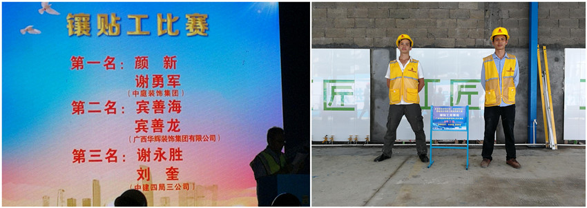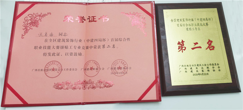 经过激烈的比赛角逐,凯发k8官网装饰集团代表队的两名选手宾善海、宾善龙,凭借着深厚的技术素养、稳定的赛场发挥,荣获镶贴工比赛亚军;代表队荣获团体奖第六名。