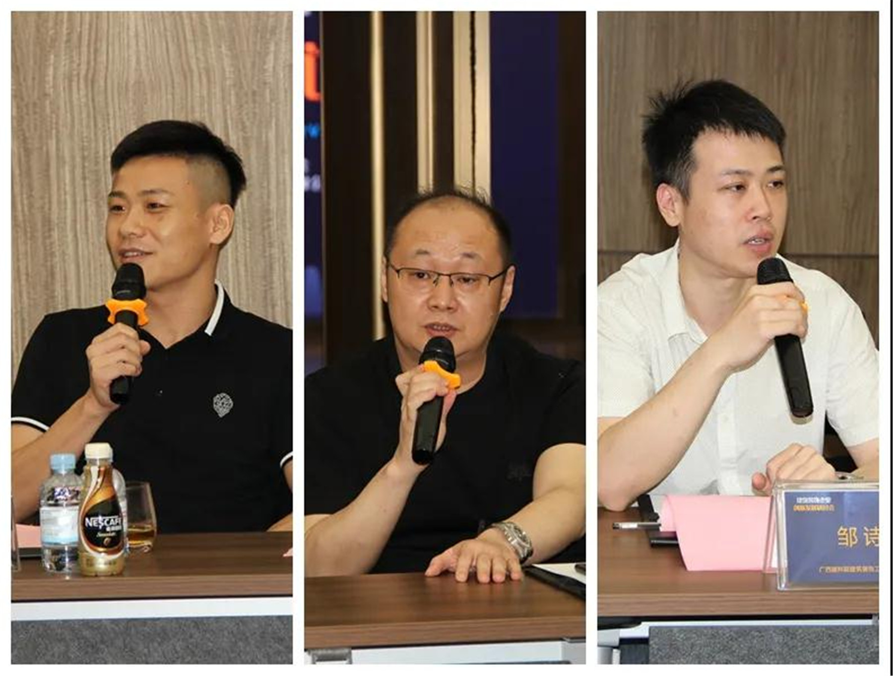 ▲(左)住宅装修分会副会长、广西中庭装饰工程集团有限公司董事长 丁胡,(中)广西渱钰川装饰工程有限公司总经理 李灵,(右)广西建科院建筑装饰工程有限公司总经理 邹诗毅