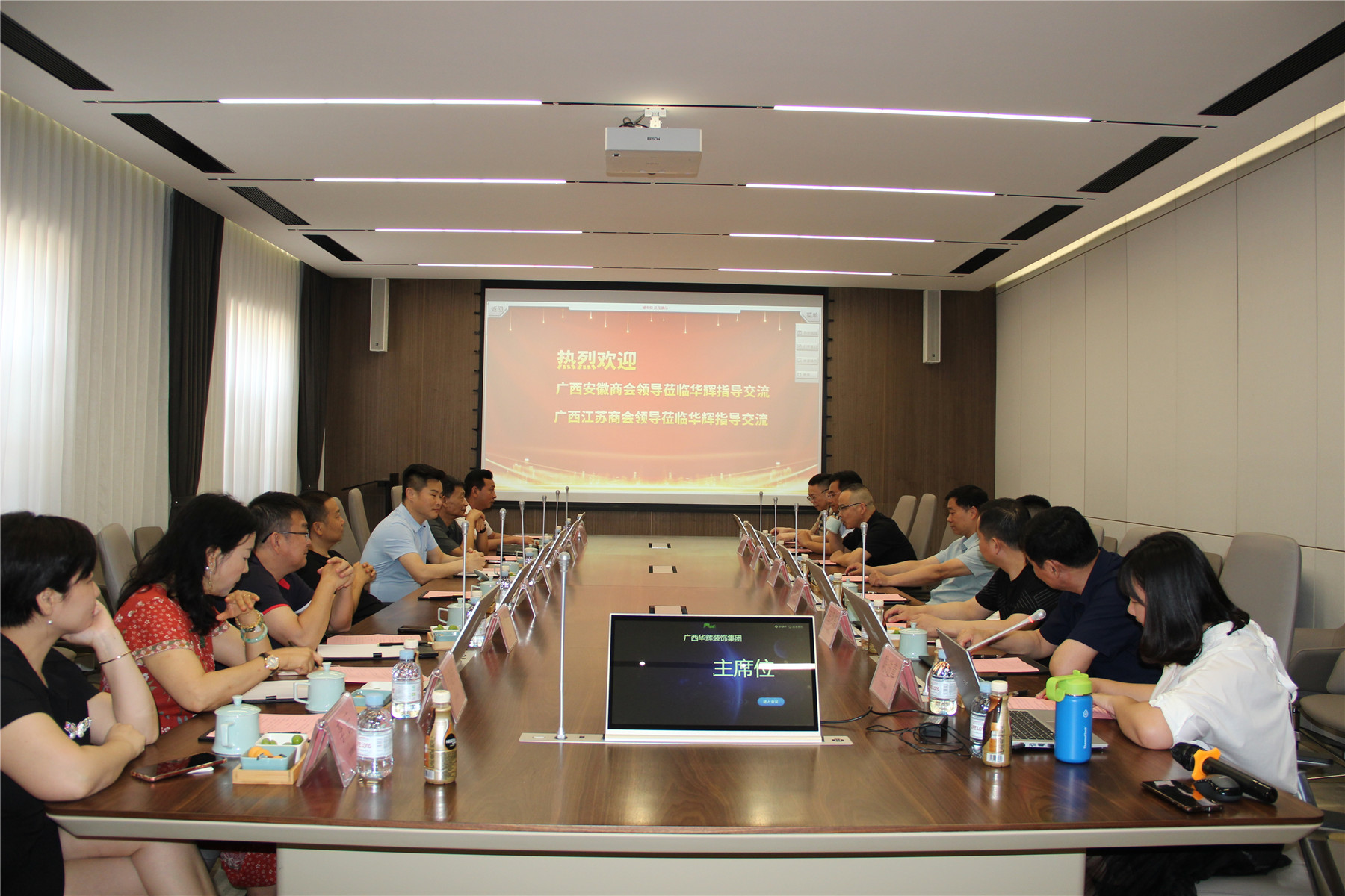 2021年5月9日,广西安徽商会会长李传德,秘书长吴格飞,执行会长赵胜利、郭中华,副会长徐兵、郑华、张清华等领导一行到访凯发k8官网装饰集团,与广西江苏商会开展友好交流,广西江苏商会会长施瑞明,执行会长杨景忠、张贤兵、杨勤伟,常务副会长、人民调解委员会主任王月霞等领导出席了座谈交流会。