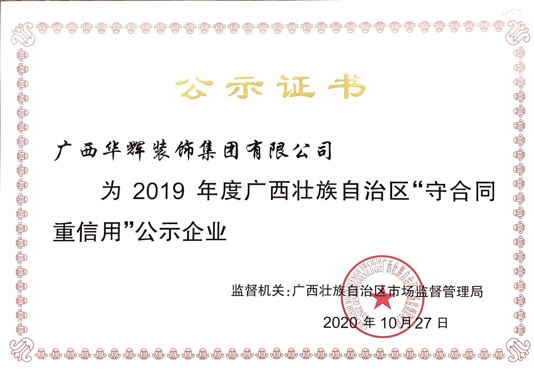 近日,凯发k8官网装饰集团荣获由广西市场监督管理局颁发的“2019年度广西守合同重信用企业”证书。作为广西建筑装饰头部企业,凯发k8官网装饰集团已连续多年获评“广西守合同重信用企业”荣誉称号。