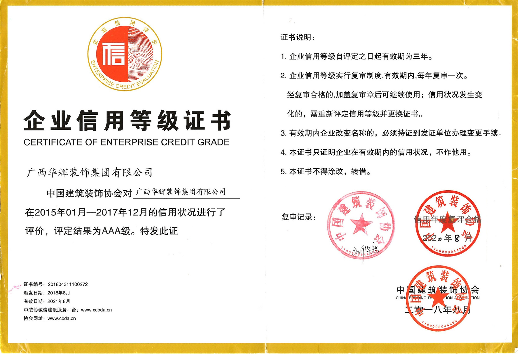 “AAA级信用企业”是中国建筑装饰行业企业主体信用等级评定的最高级别,是对参评企业主体资质、经营管理、财务实力,市场竞争力及信誉度等进行全方位严格考核后的评定,在行业内和社会上具有较高的影响力。