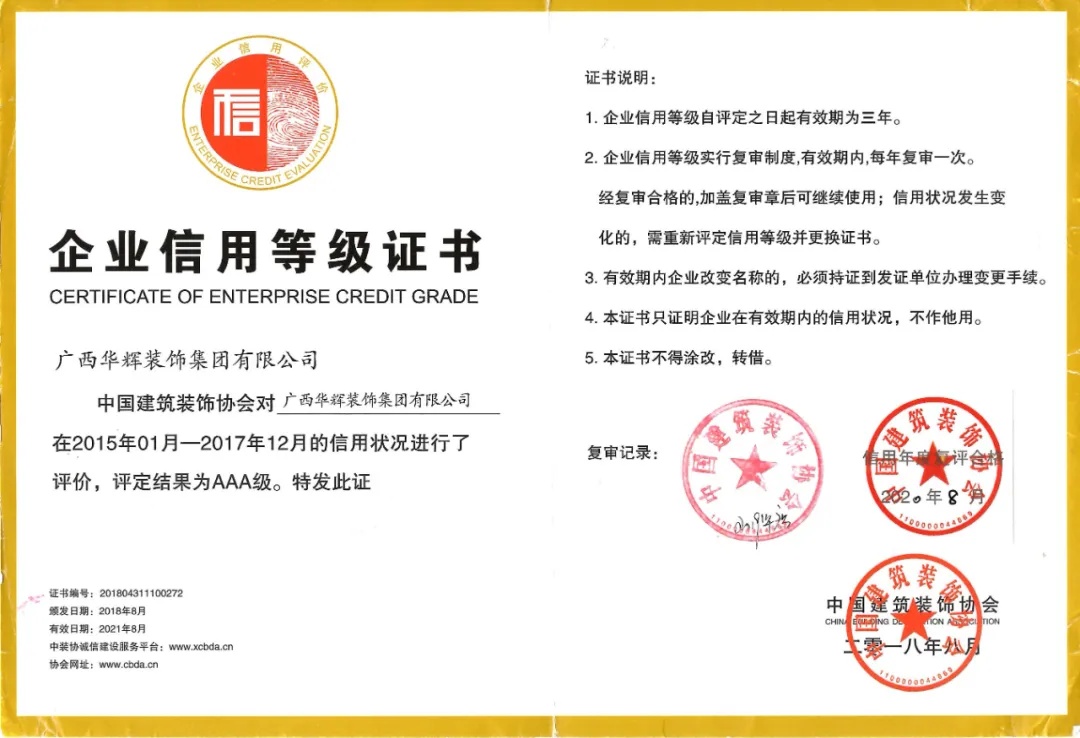 “AAA级信用企业”是中国建筑装饰行业企业主体信用等级评定的最高级别,是对参评企业主体资质、经营管理、财务实力,市场竞争力及信誉度等进行全方位严格考核后的评定,在行业内和社会上具有较高的影响力。
