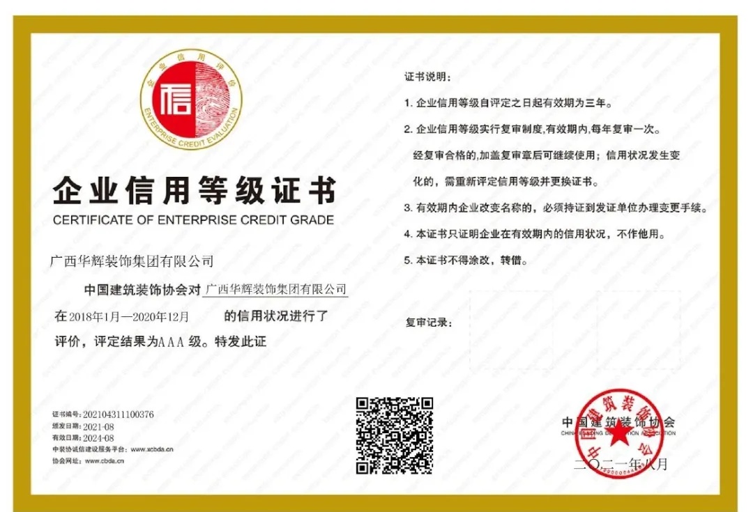 近日,凯发k8官网凭借多年来坚持诚信经营、良好履约,再度获评中国建筑装饰行业企业信用AAA级(最高级)评价,这是凯发k8官网连续6年获评该项信用等级。
