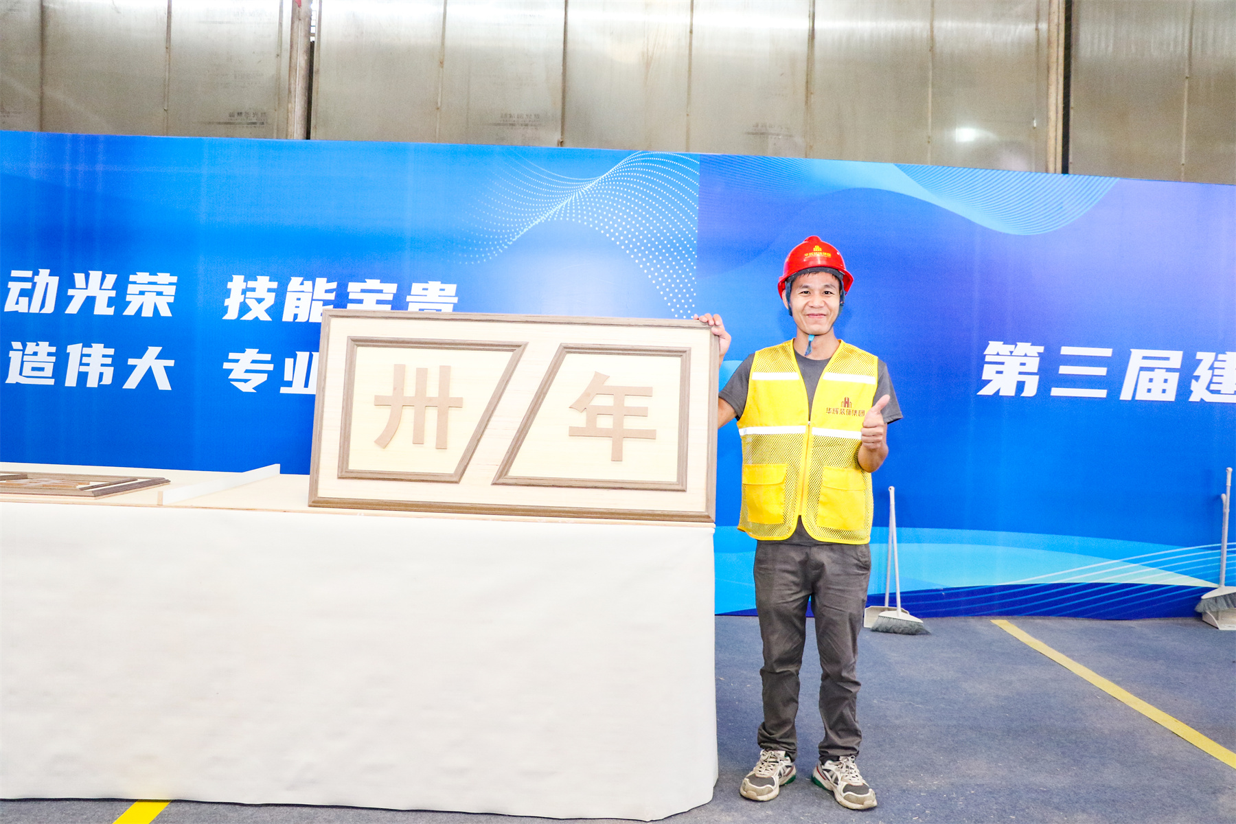 ▲广西建设工会二级调研员伍文军为荣获“ 精细木工专业”实操竞赛成果评定一等次奖项获奖者颁奖