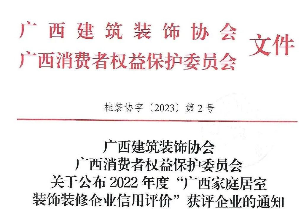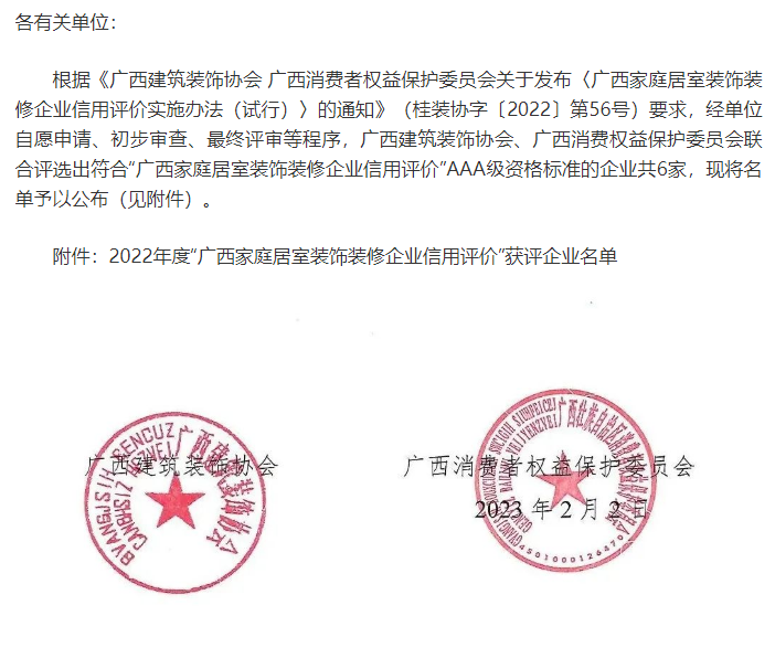 2023年2月2日,广西建筑装饰协会、广西消费者权益保护委员会联合发布通知,评选出符合“广西家庭居室装饰装修企业信用评价”AAA级资格标准的企业共6家,广西凯发k8官网装饰集团有限公司为获评企业之一。